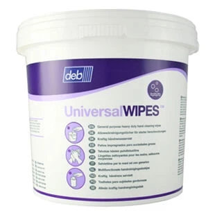 These Deb Universal Wipes are designed for general hand cleaning, such as removing oil, grease and grime. The impregnated tough, extra large wipes are available in a handy, easy-to use tub which can be used whilst on the move, with no need for water. Tub of 150.