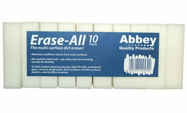 The Erase All Stain Removing Magic Sponge removes stubborn stains and marks from most surfaces. No need for chemicals, use with water for cleaning, use dry for dusting. Ideal for cleaning tea stained cups, stainless steel, floor surfaces, paintwork, plastics, glass, bathrooms etc. Pack of 10.