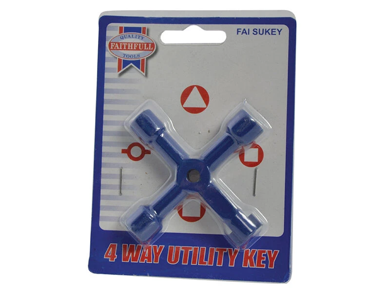 The Faithfull 4-Way Services Utility Meter Key is made from chrome vanadium steel for strength and durability. It features four popular key shapes: square, triangular and two-way.