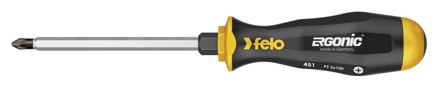 The Felo ergonomic hammer cap pozidriv screwdriver with a three component gel handle providing maximum comfort.