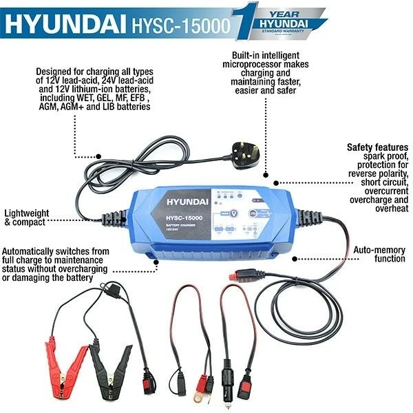 Hyundai HYSC15000 Smart Battery Charger For 12/24v Batteries