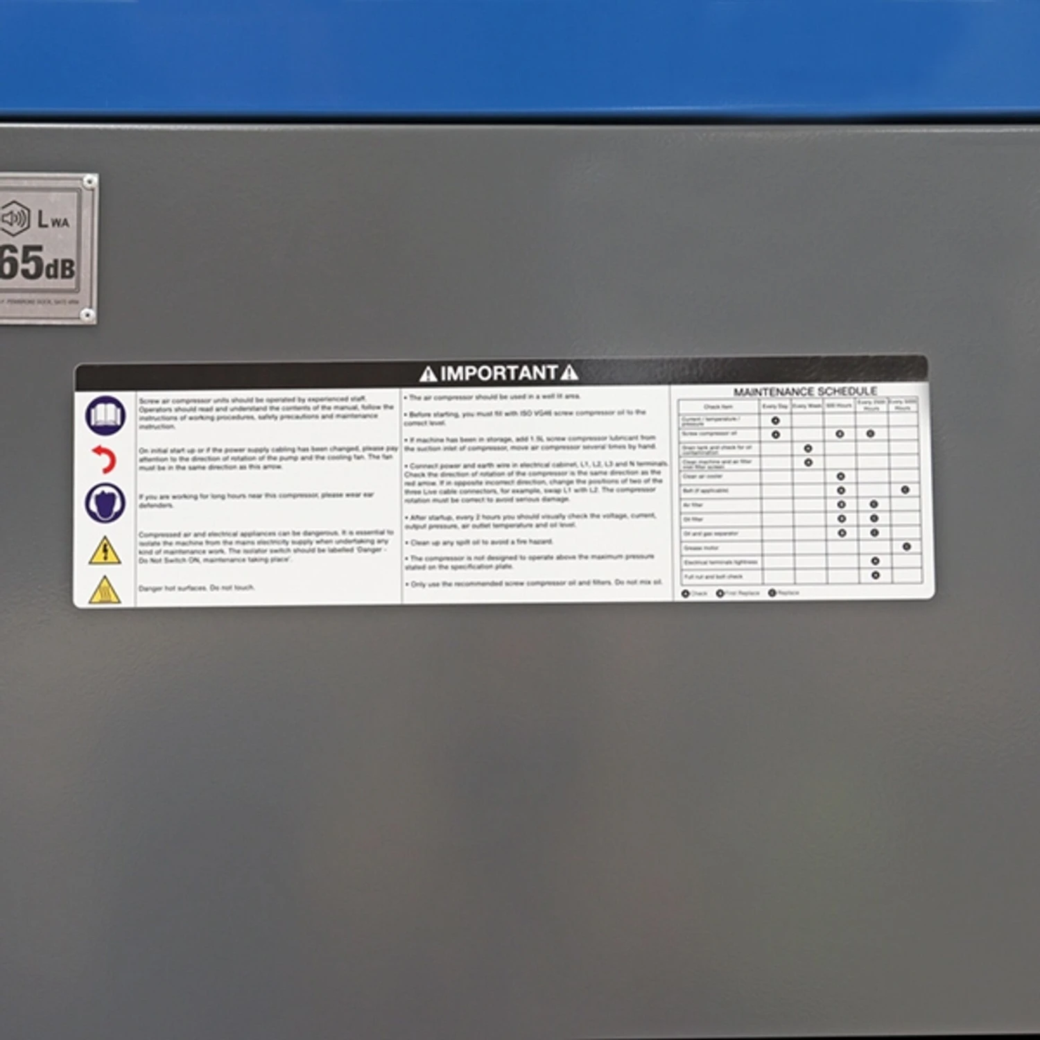 The high-efficiency motor and screw compressor unit is designed for continuous operation, with long service intervals and low maintenance and features an integral air dryer to remove moisture entering the tank.
