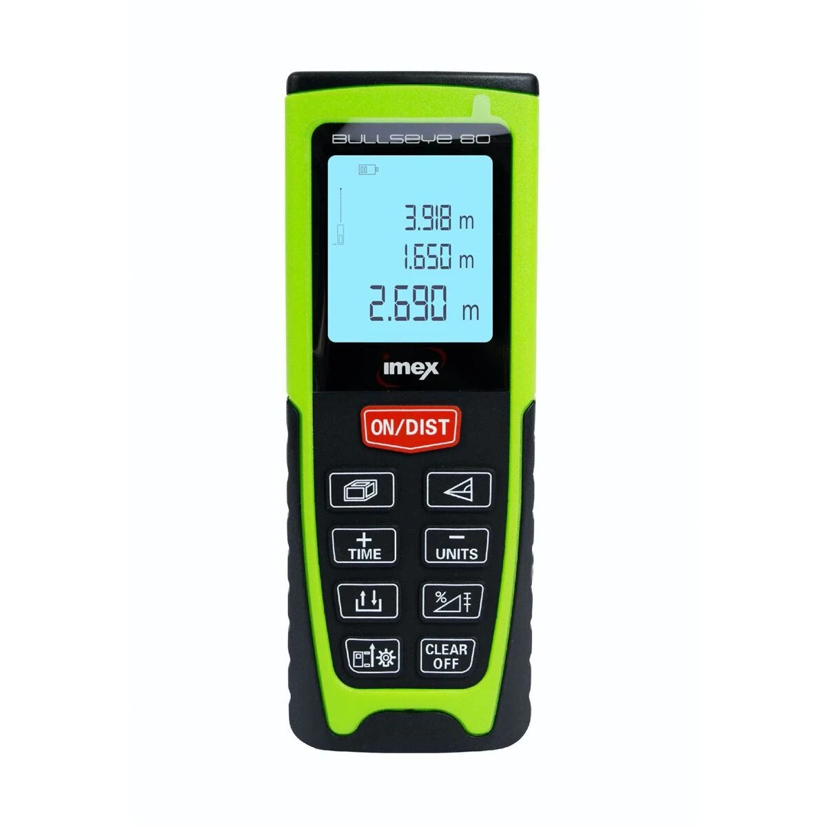 The Imex Bullseye laser distance measurer is small enough to easily fit in your pocket, toolbag or even clip onto your folder. These handheld battery-powered devices feature state-of-the-art electronics and an easy to read LCD screen that simplifies the process of taking long measurements and performing calculations.