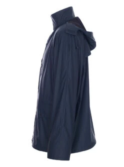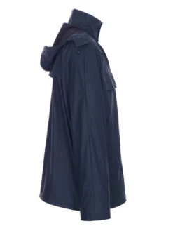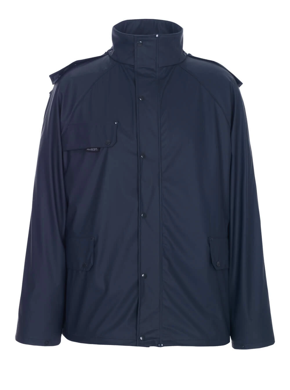 Wind and waterproof. Welded seams. Hood which can be rolled into collar. Fastening with zip and storm flap with press studs. Chest pocket with flap and press stud. Front pockets with flap and press stud fastening. Ventilation in the back. Adjustable elastic drawstring at waist. Press stud fastening at cuffs.