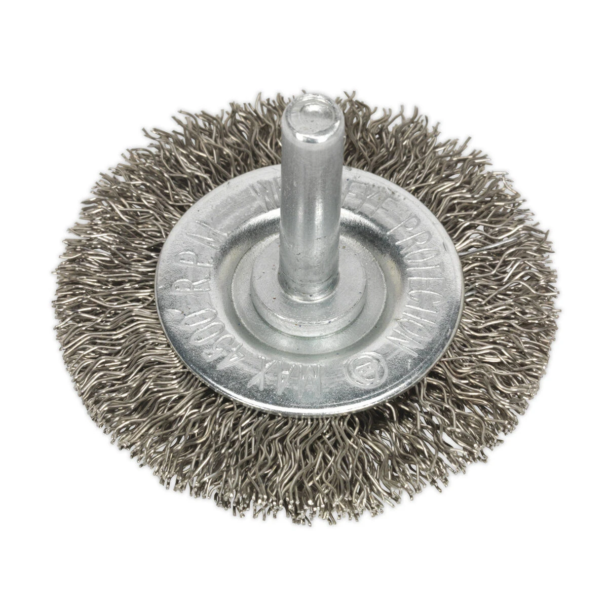 The Sealey flat wire brush with crimped stainless steel filaments. The wheel has a 50mm width and a 6mm shaft.