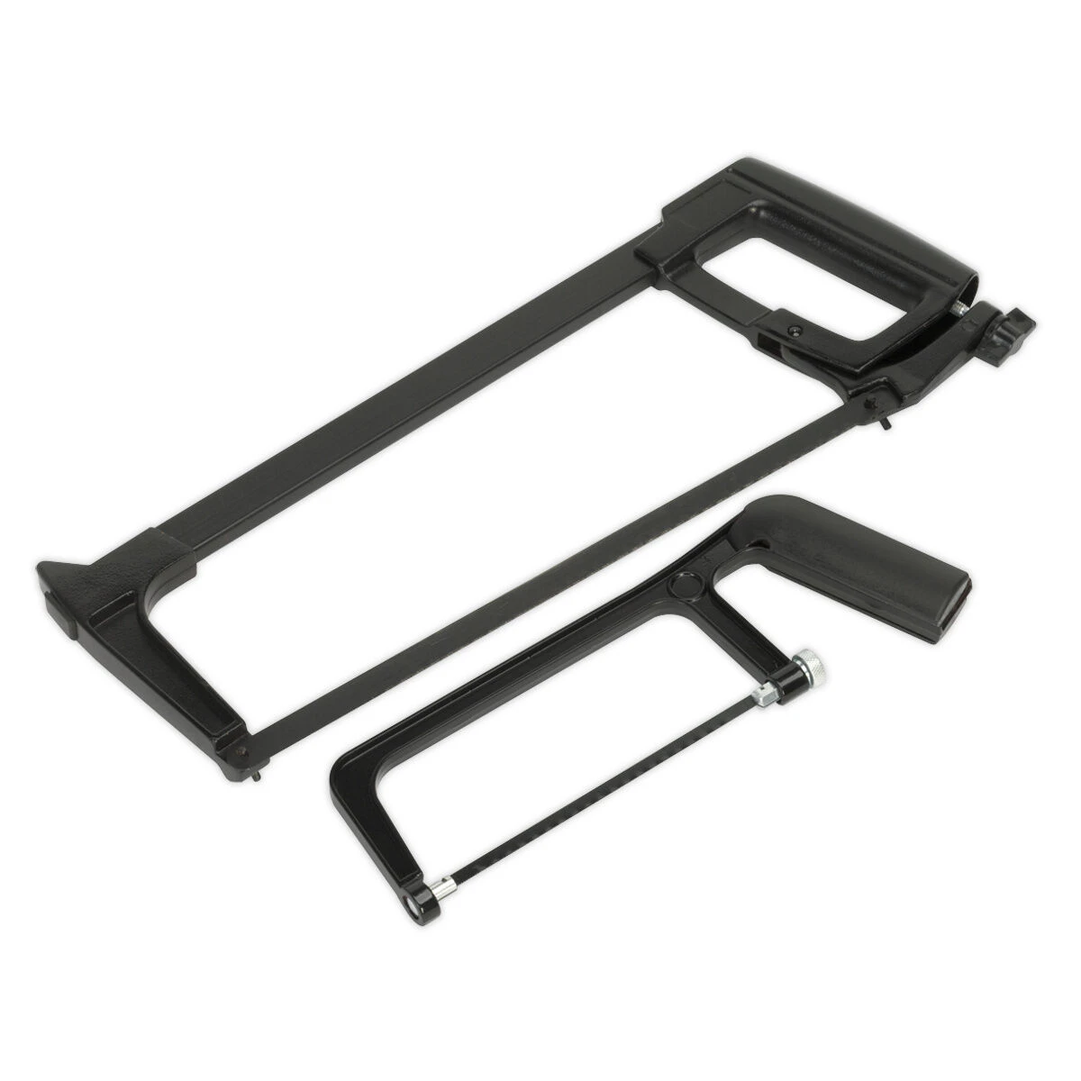 Two piece set comprising 300mm engineer’s hacksaw and 150mm junior hacksaw. Engineer’s hacksaw features a die-cast handle and stock with lightweight aluminium frame. Twin (90deg and 45deg) blade positions for comfortable and accurate cutting. Junior hacksaw features an aluminium frame and comfortable composite handle. Multi-position clamp permits blade to be mounted at different angles. Both supplied with a carbon steel blade suitable for cutting a variety of materials.