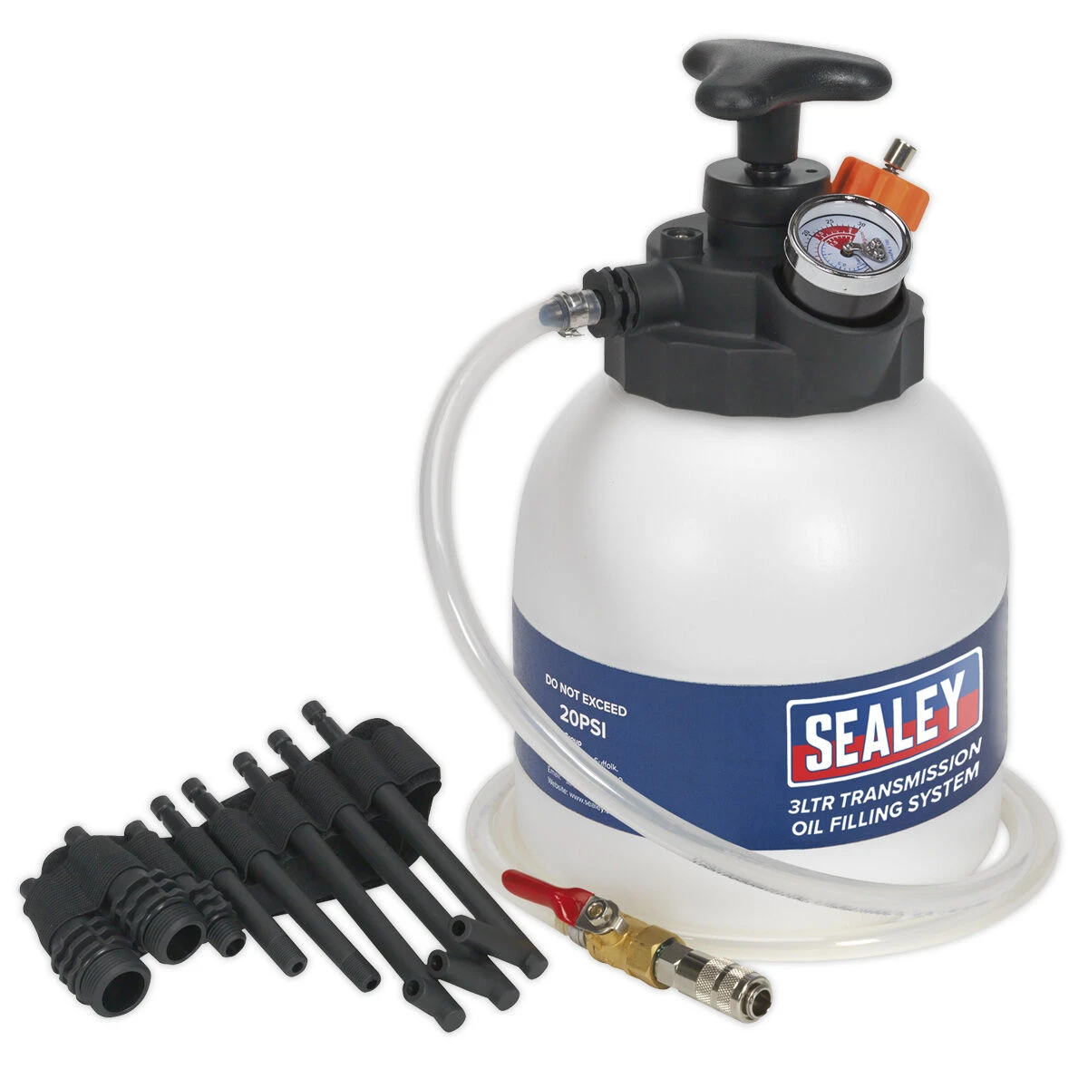 Pump operated oil dispensing unit with a 3L capacity. Supplied with five multipurpose and three vehicle specific automatic transmission fluid adaptors. Features a fluid control and depressurising valve.