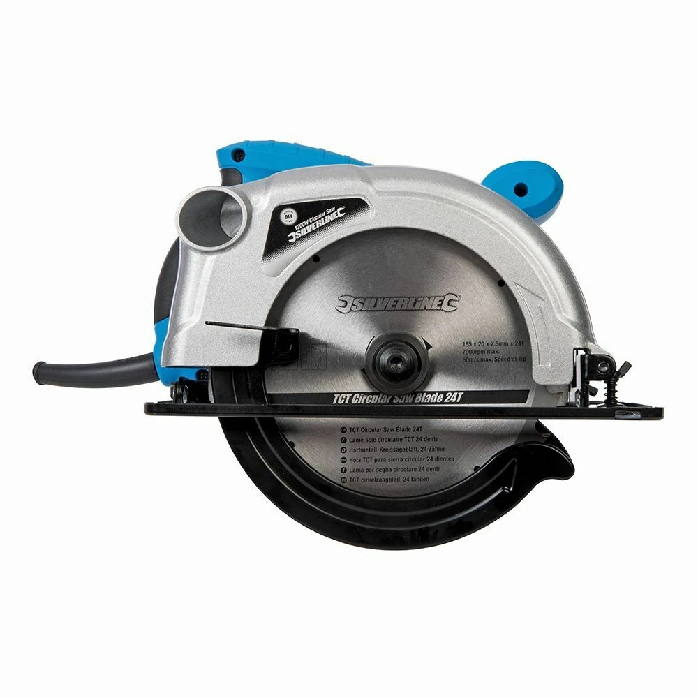 – Circular saw with fast-cutting tungsten carbide-tipped 24T 185mm dia blade and 0 45deg bevel angle adjustment with scale